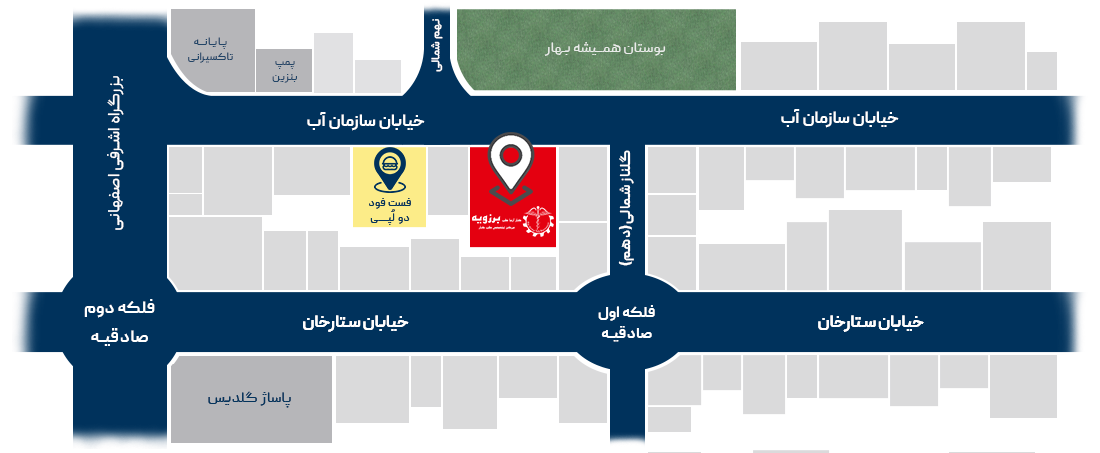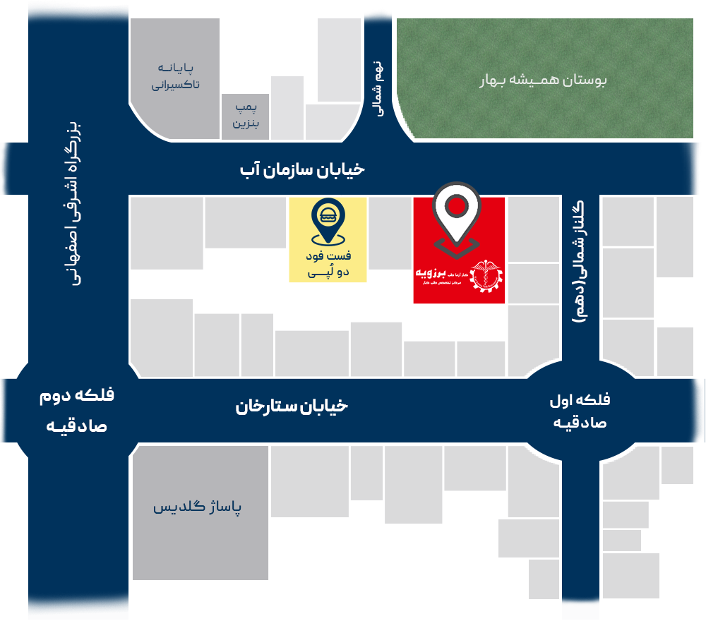 فلکه دوم صادقیه، اشرفی اصفهانی، چهار راه سازمان آب، خیابان سازمان آب شرقی، بعد از فست فود دولپی، ساختمان عرشیا، پلاک ۳۱۲، طبقه اول، واحد ۳